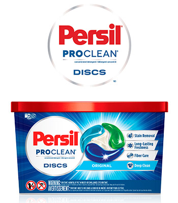 Persil® ProClean® Discs™ are single use pacs of concentrated laundry detergent in the convenient form of pre-measured discs. Persil® ProClean® Discs™ have four chambers and deliver a powerful clean. Persil® Discs™ lift stains, deliver long-lasting freshness, provide fibre care, and deliver a deep clean.