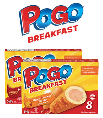 New Pogo® Breakfast! Fast. Filling. Fun. Enjoy breakfast in just 55 seconds. A sausage wrapped in biscuit batter with no artificial colours, flavours or by-products.